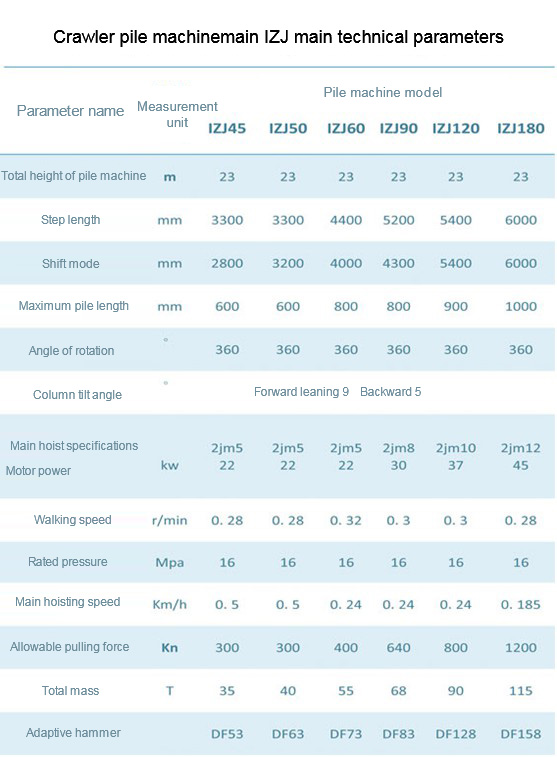 IZJ series crawler pile machine adopts electric crawler design. There are four hydraulic legs before and after the pile machine. It has the characteristics of stable and fast walking, accurate and reliable for pile, simple maintenance and operation. The utility model can realize the construction of various working equipments and methods, such as guide rod diesel hammer, cylinder diesel hammer, vibration hammer, hydraulic hammer, long spiral drilling rig, etc.