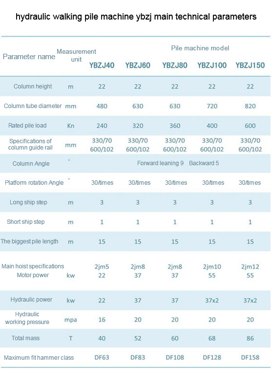 • YBZJ Series Hydraulic Walking Pile Machine is a kind of foundation construction equipment planting village depending on the use of ship-shaped track walking, with good stability, complete functions and other characteristics. According to the construction requirements can be equipped with guide rod diesel hammer, cylinder diesel hammer, vibration hammer, hydraulic hammer, long spiral drilling rig and other working equipment. It is widely used, reliable in performance and easy to move.